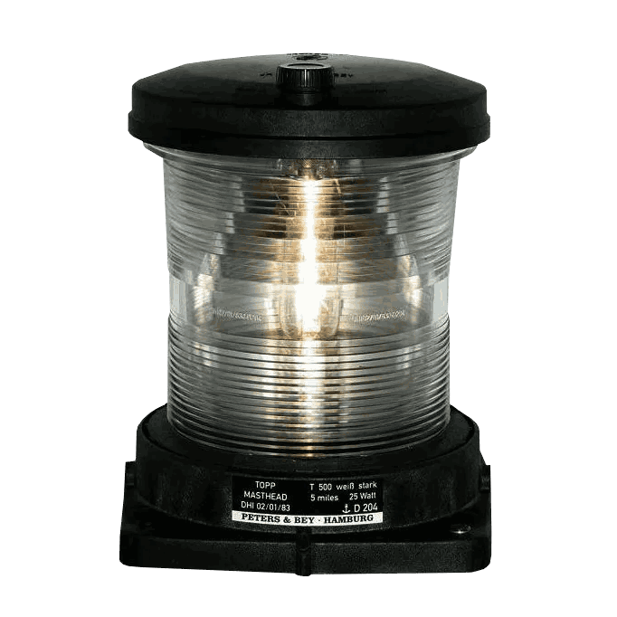 Sikre skipets synlighet fra øverst oppe med PB 500 Topp-lanterne, designet spesielt for båter under 50 meter. Denne solide glødelanternen gir pålitelig plasseringlys (topplyset), og oppfyller alle relevante krav til navigasjonsbelysning. 5nm.