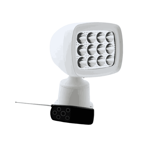 Denne fjernstyrte LED lyskasteren er skreddersydd for bruk i båter opp til ca. 30 fot, og tilbyr kombinasjon av styring, rekkevidde og energieffektiv drift. Konstruert med 12 divisjoner av Osram LED (12 × 5 W), gir den pålitelig og robust belysning under maritime forhold. Den har 360° horisontal manøvrering og ±70° vertikal utsving, som gir god dekning og fleksibilitet.