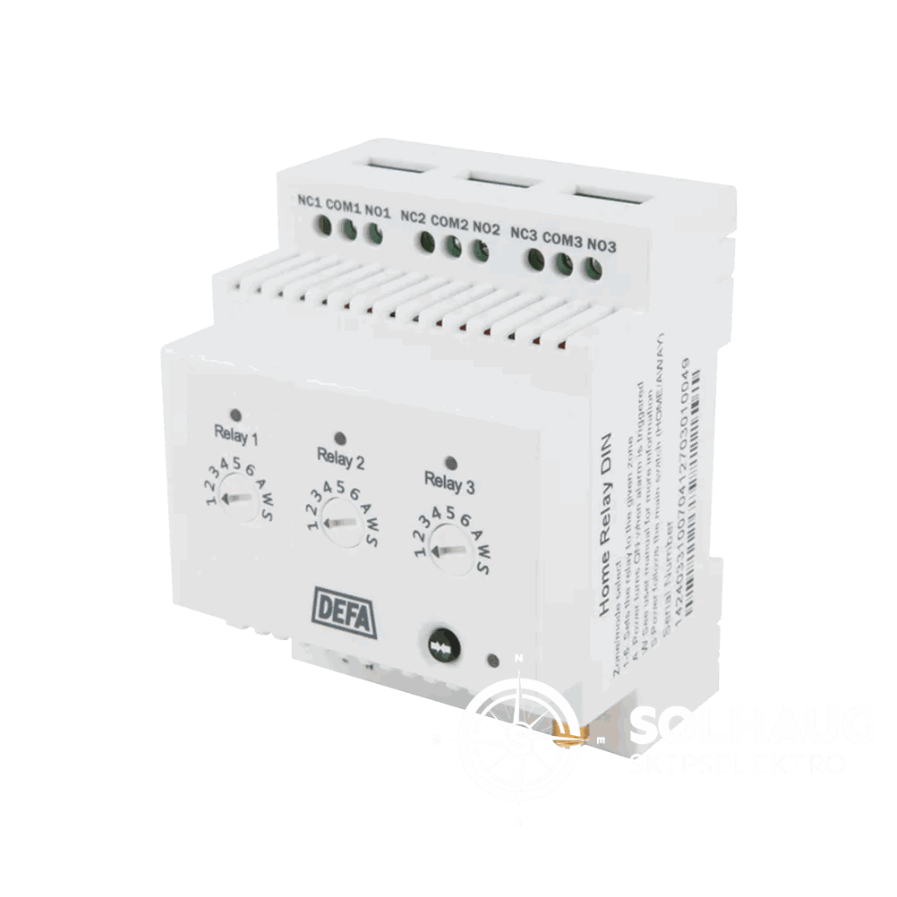 DEFA Home Relay DIN er en 230V releenhet med trådløs kommunikasjon, for montering i sikringsbokser som bruker DIN-skinne. Releenheten benytter tre potensialfrie 16A releer som hver for seg kan kobles til en sone (1-6) eller funksjon (A, W, S) på en DEFA Home Base Unit. Releenheten kan benyttes på samme måte som en DEFA Home Socket. Hvis sonen er i brytermodus skrur releet strømmen PÅ og AV for den innstilte sonen. I termostatmodus vil releet/ sonen benytte temperaturen avlest fra den trådløse temperaturføleren som er tilknyttet sonen. Eksempler for bruk er varmekabler, varmtvannstanker, lys, etc. Må installeres av en elektriker.