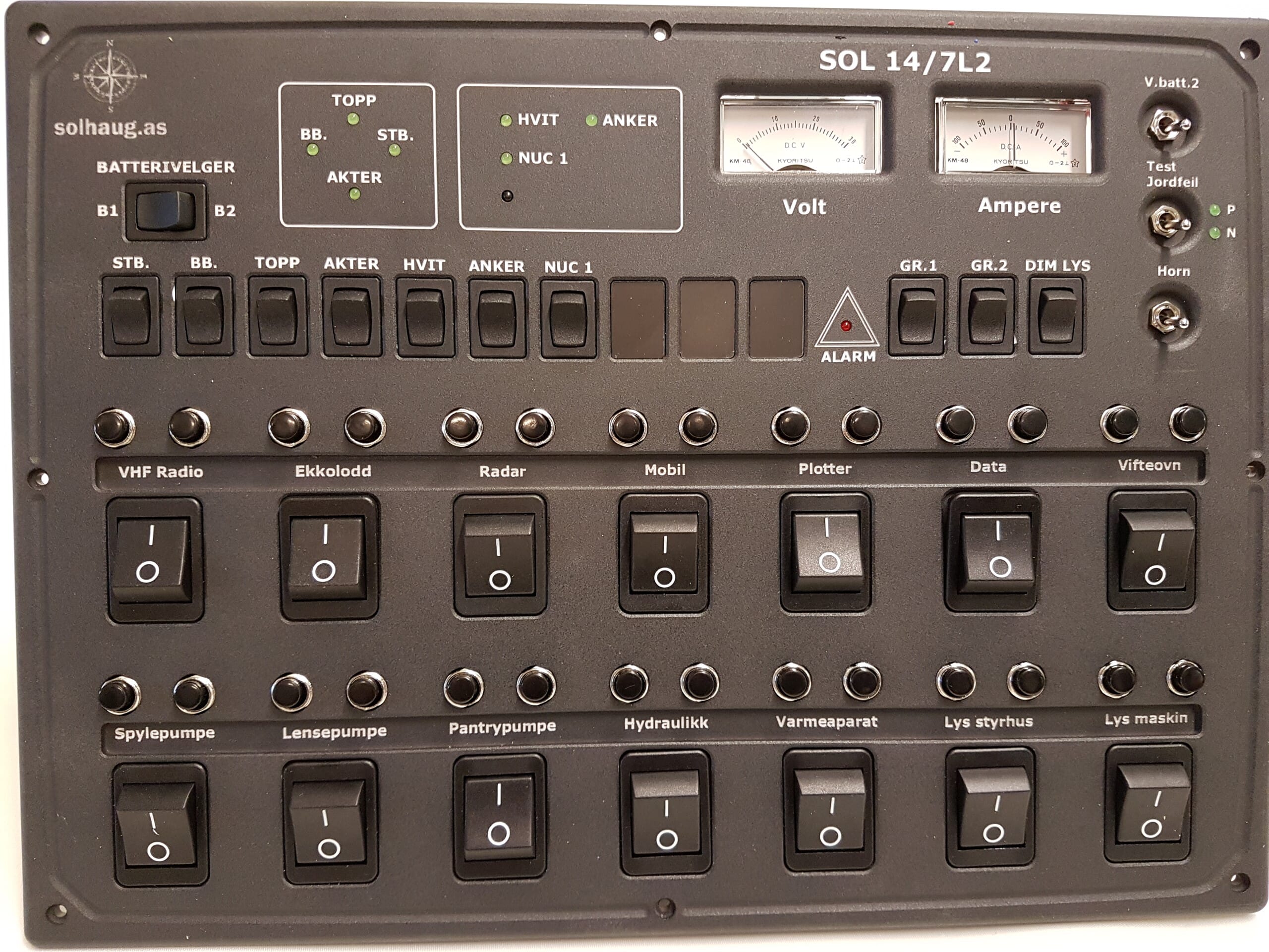 Dette Sikringsskapet SOL-14 24V gir deg full oversikt og kontroll over lanternene ombord med hele 7 innfelte LED-V/A-lanterner som viser spennings- og strømstatus visuelt. Det er bygget for det maritime miljøet, med solide komponenter og klar dokumentasjon. Perfekt for større fartøy med behov for sentral overvåkning av lanternesystemet.